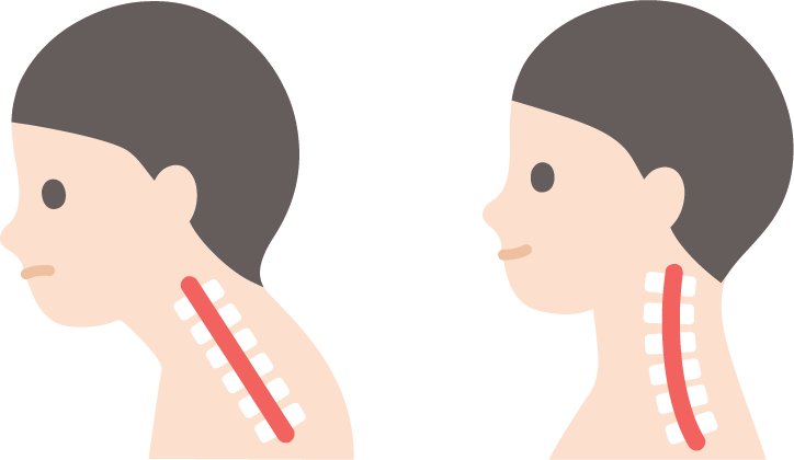 ストレートネックとは、本来は緩やかなカーブを描いている首の骨(頸椎)が、主に長時間のスマートフォンやPC操作などにより真っ直ぐになってしまう状態を指します。ストレートネックを放置すると、慢性的な首や肩のこり、頭痛、めまいなどを引き起こし、重症化すると首の変形に至る場合もあると言われています。